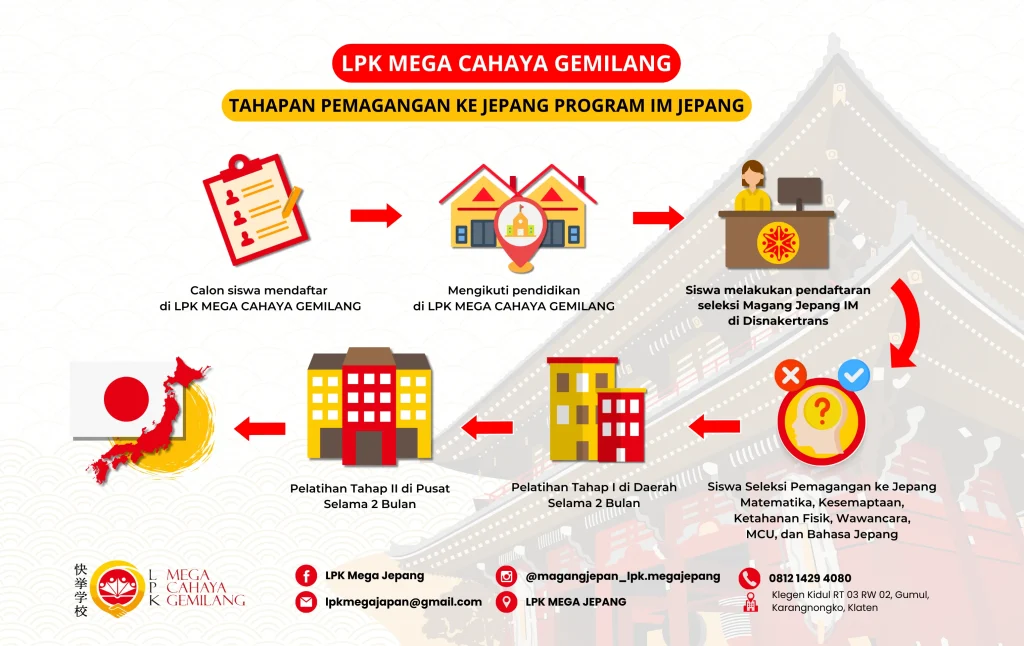 Pemagangan ke Jepang IM JAPAN adalah program kerjasama KEMNAKER RI – IM JAPAN selama 3 – 5 tahun. Bisa kembali lagi ke Jepang denagan ketentuan tertentu.Juga diharapkan terjadinya transfer Ilmu, etos kerja, kedisiplinan kepada peserta magang selama menjalankan proses pemagangan.